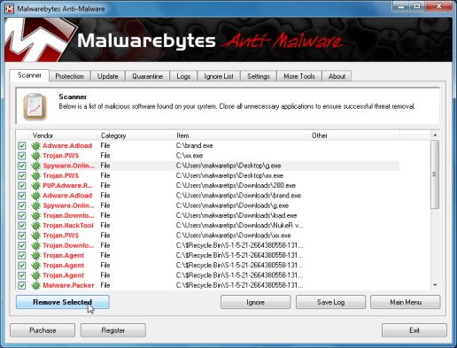 - You’ll certainly be given a screen demonstrating the adware and spyware infections that Malwarebytes’ Anti-Adware and spyware has detected.Please be aware the infections found might be diverse from what’s proven within the image.Make certain that things are Checked (ticked) and then click the Remove Selected button.