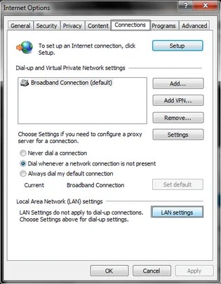 - Visit the tab Connections.At the end, click LAN configurations.