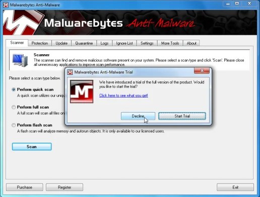 - Malwarebytes Anti-Adware and spyware will start and you will be motivated to begin an effort period , please choose ‘Decline‘ once we would like to make use of the on-demand scanner.
